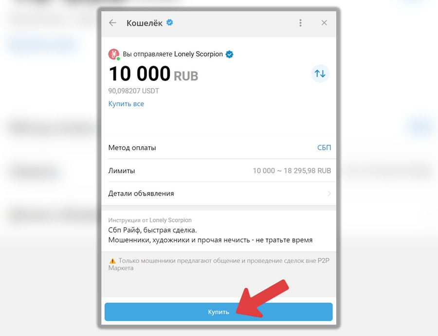 Выберите подходящего вам продавца из списка, введите сумму в рублях, на которую хотите купить крипту, выберите метод оплаты и нажмите “Купить”:
