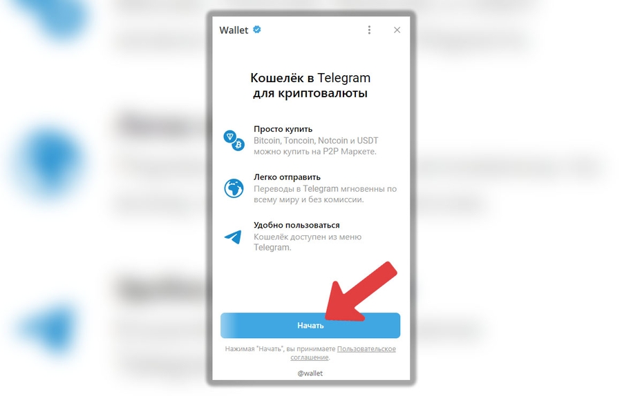 Перейдите в кошелек, согласитесь с условиями пользования и нажмите “Начать”: