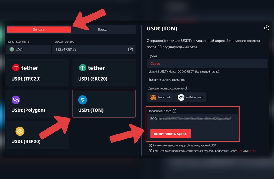 В этом случае комиссия составит всего 1 USDT. Для этого в поле для ввода адреса получателя скопируйте адрес USDT (TON), выданный вам для пополнения на Битце: