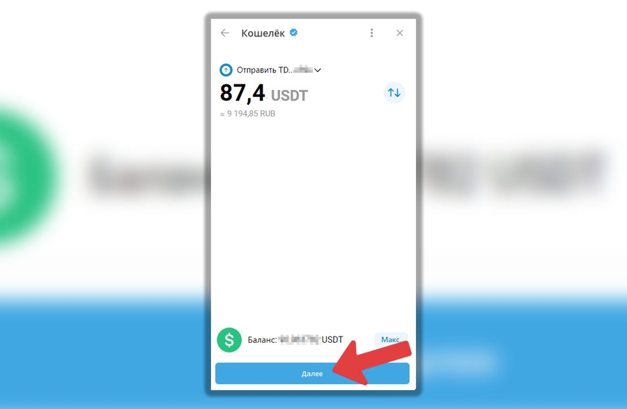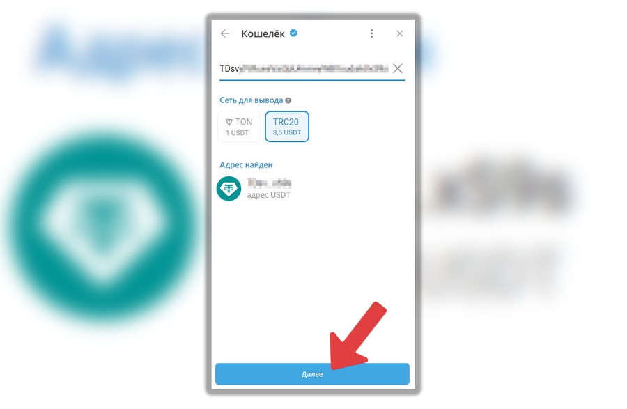 В поле “Адрес” скопируйте адрес кошелька, выданный вам для пополнения счета на Битце и нажмите “Далее”: