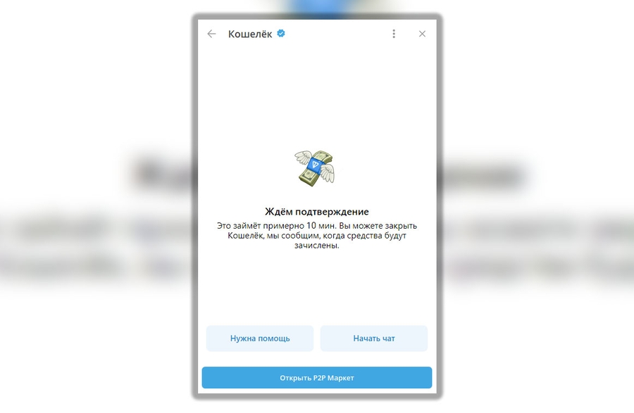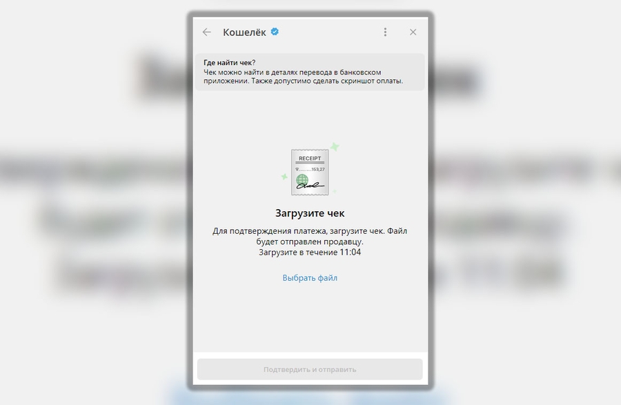 После загрузите чек в форму кошелька Телеграма и нажмите в ней “Подтвердить и продолжить”. Останется подождать несколько минут, пока продавец подтвердит поступление средств и отправит вам крипту.
