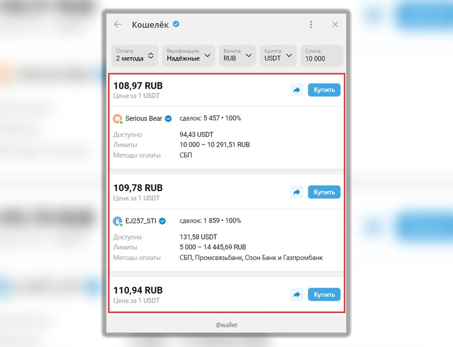 Когда все заполнено, кошелек отобразит список из продавцов, подходящих под наши требования. В самом верху списка будут продавцы, предлагающие лучший курс обмена.