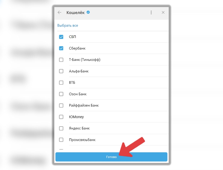 Оплата - метод оплаты, которым вы готовы совершить рублевый перевод на реквизиты продавца. Для нашего примера выберем в нем “Сбербанк” и “СБП” - наиболее распространенные методы. Далее жмем "Готово":